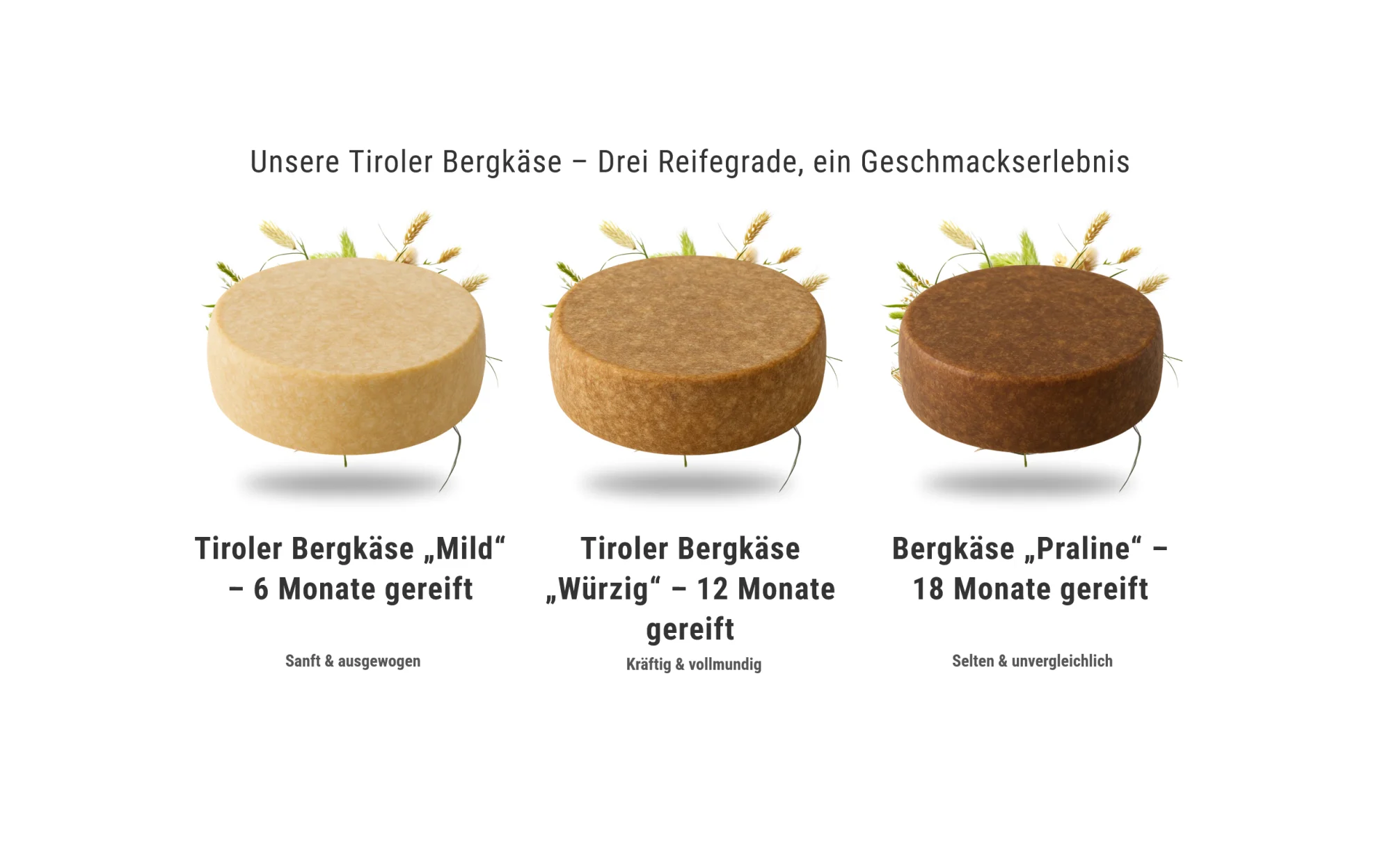 Würzig, geschmeidiger Hartkäse aus feinster silofreier Heumilch (Rohmilch), 12 Monate gereift mind. 50 % Fett i.Tr.